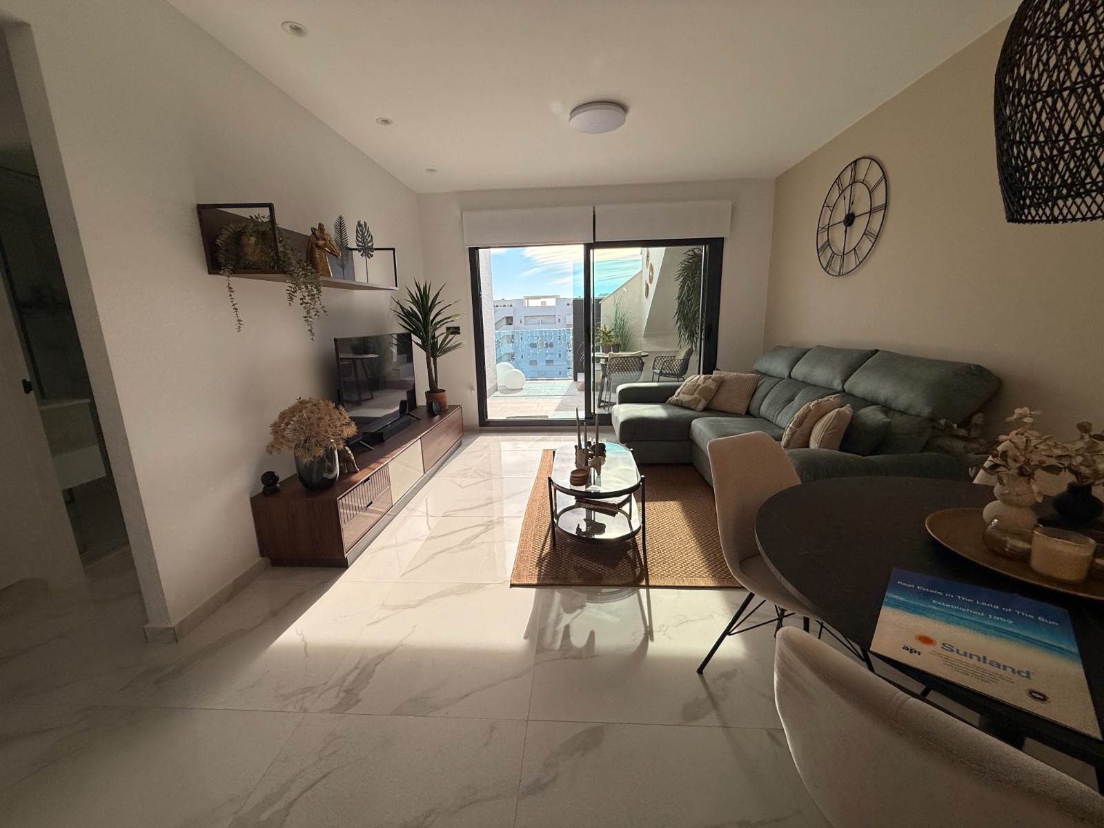 Discover the penthouse that has it all. This stylish top-floor apartment features 2 spacious bedrooms and 2 modern bathrooms, including a comfortable en-suite. The home combines contemporary design with maximum comfort in an exceptional location. The highlight is the private solarium, where you can relax in the sun and enjoy breathtaking panoramic views of the natural La Mata Lake. The residence is modern and exclusive, just minutes from the most beautiful beaches of the Costa Blanca. The complex offers premium amenities such as a swimming pool, fitness center, sauna, kids' play areas, and private parking. Whether you're looking for a relaxing holiday home, a smart investment, or a permanent sunny residence, this penthouse has it all. A unique opportunity not to be missed — your place in the sun is waiting.